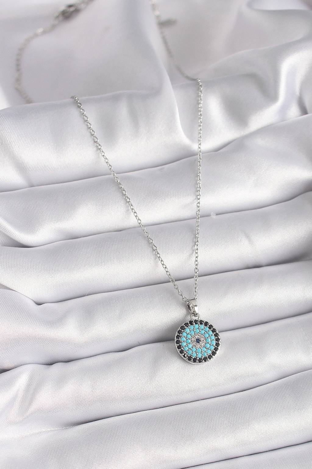316L Çelik Gümüş Renk Zincir Nazar Boncuk Madalyon Model Kadın Kolye - TJ-BKO9485