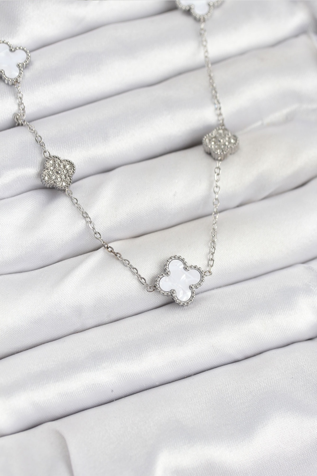 316L Çelik Zincir Gümüş Renk Beyaz ve Zirkon Taşlı Yonca Kadın Kolye - TJ-BKO10588