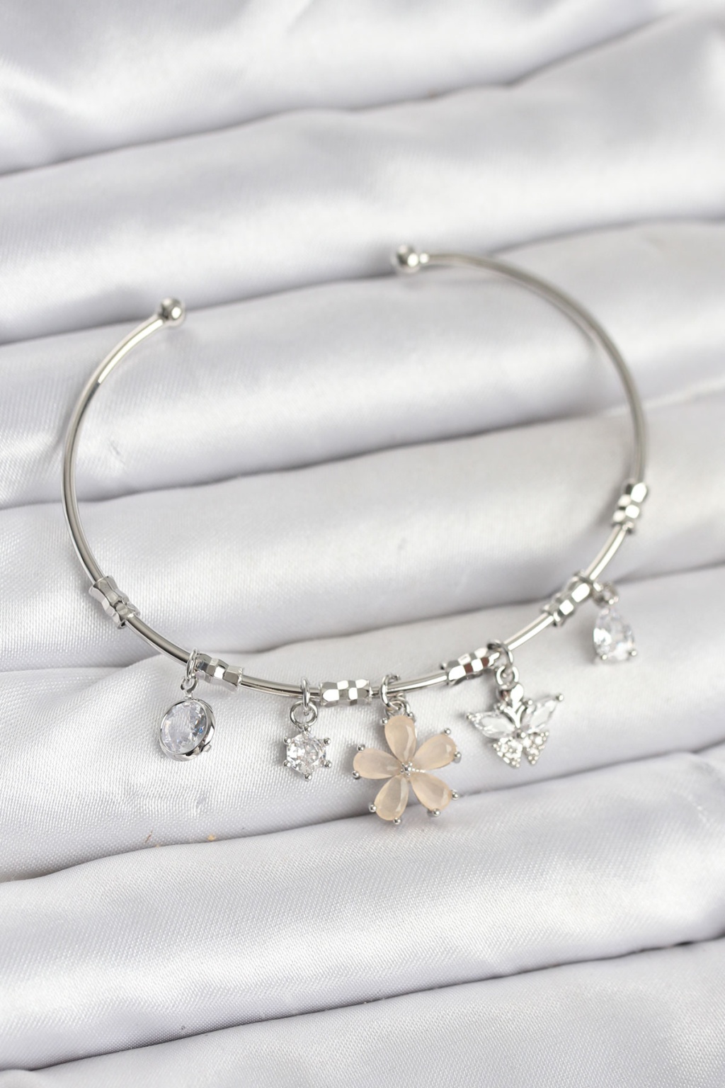 Çiçek ve Kelebek Charmlı Gümüş Renk Pirinç Kadın Bileklik - TJ-BB8050