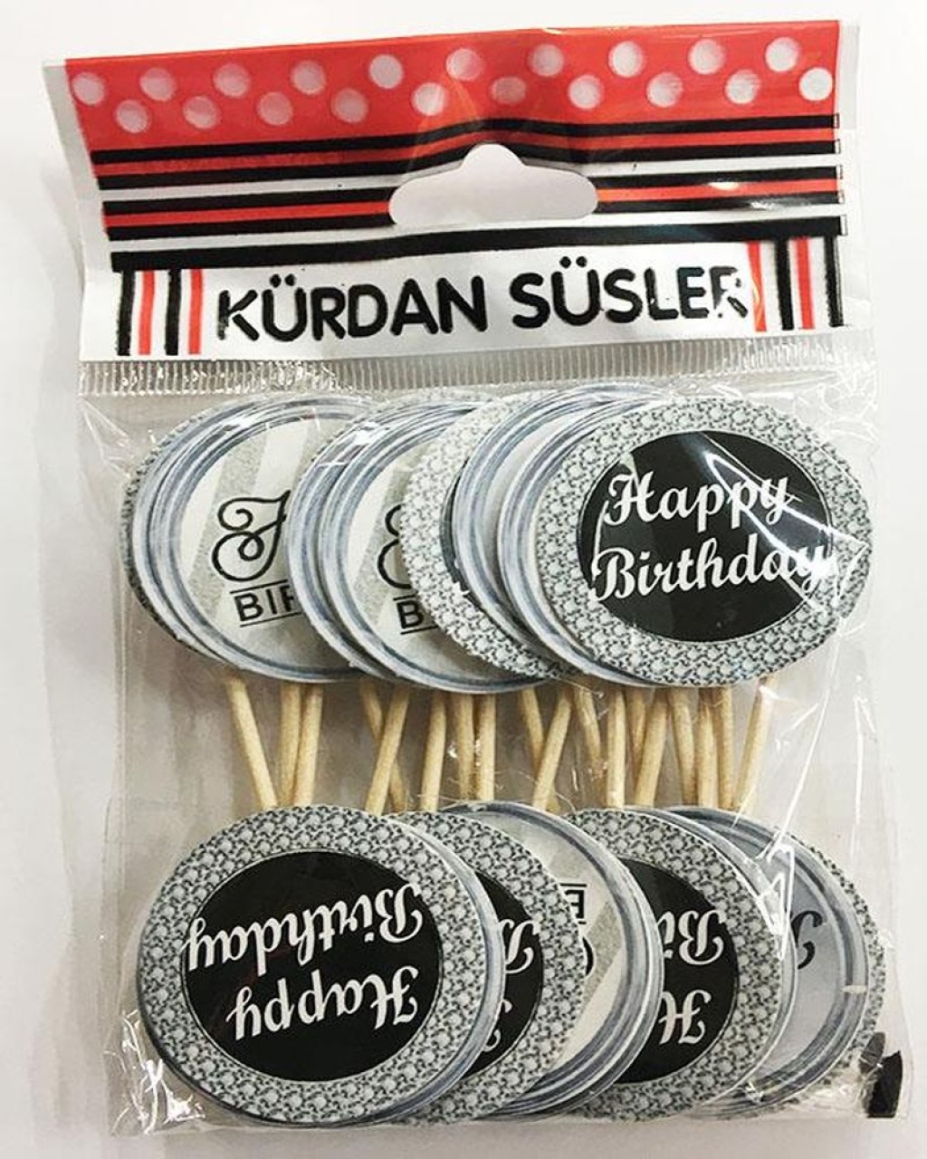Gümüş Siyah Happy Birthday Parti Kürdan Süsü 20 Adet
